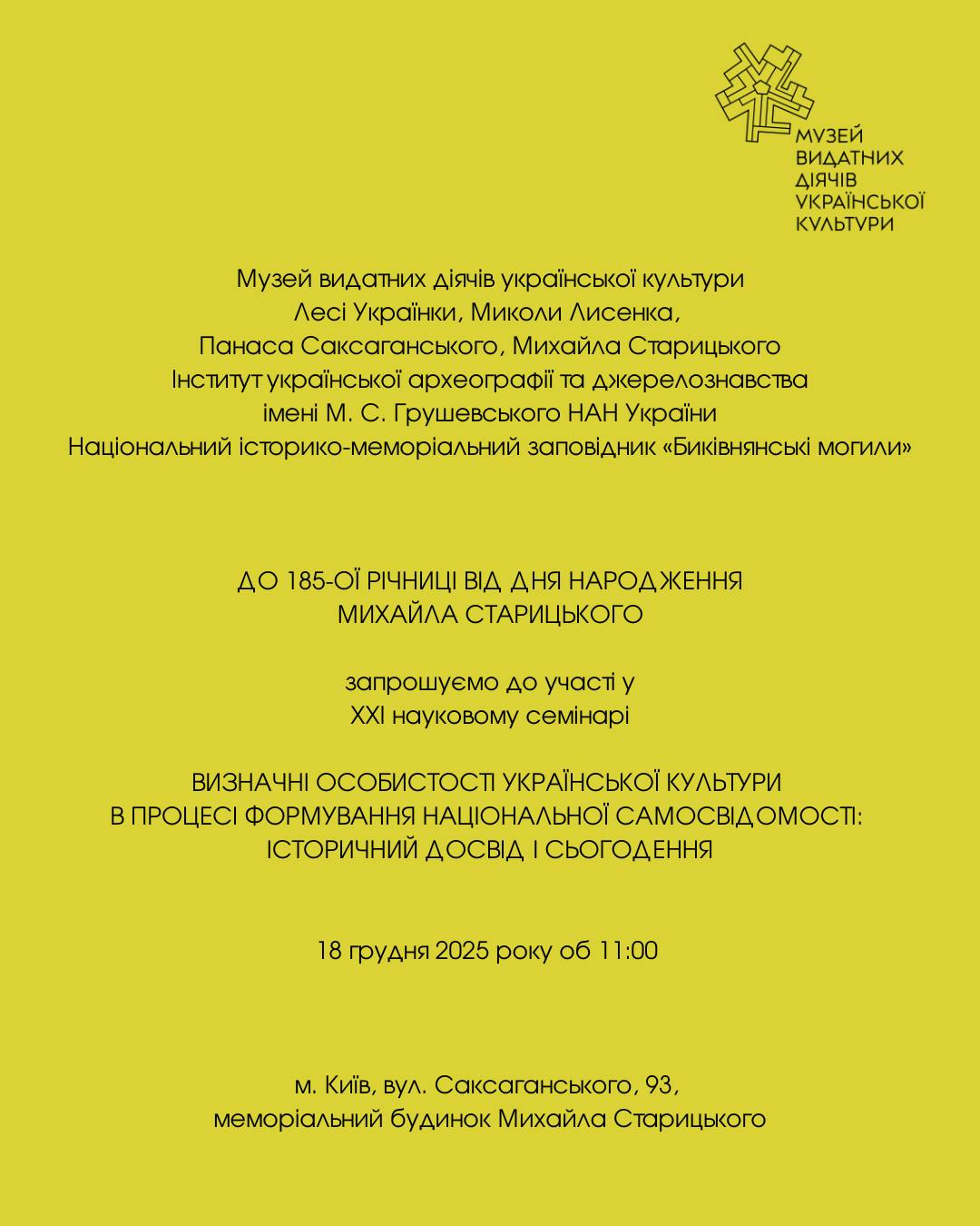 Запрошуємо до участі у ХХІ науковому семінаріВИЗНАЧНІ ОСОБИСТОСТІ УКРАЇНСЬКОЇ КУЛЬТУРИ В ПРОЦЕСІ ФОРМУВАННЯ НАЦІОНАЛЬНОЇ САМОСВІДОМОСТІ:ІСТОРИЧНИЙ ДОСВІД І СЬОГОДЕННЯДетально про участь тут: https://drive.google.com/file/d/1Lc6L0tYM8wnPNTXF6A5OCn7qBWA3OeVc/view?usp=sharing