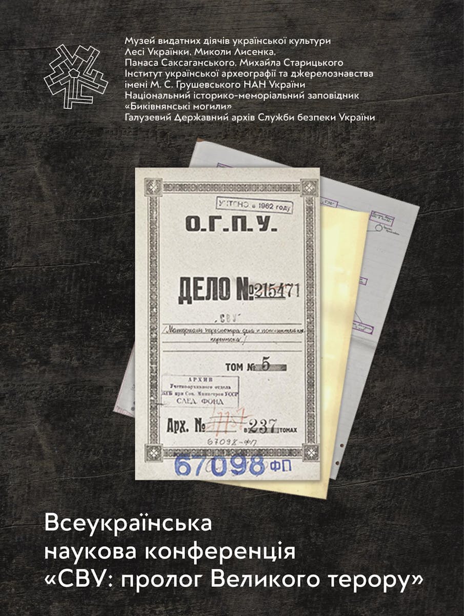 Всеукраїнська наукова конференція «СВУ: пролог Великого терору»Основні проблеми, які будуть розглянуті на конференції: - процес СВУ: історіографія, джерельна база, проблеми дослідження; - фальсифікація справи «Спілка визволення України»: роль влади та її репресивних органів; - «Спілка визволення України»: особистості, доля, спадщина; - наслідки процесу СВУ для українських культурних і науково-освітніх інституцій; - справа СВУ: регіональний вимір; - процес СВУ у засобах масової інформації; - українська політична еміграція про процес СВУ та його наслідки.До участі в конференції запрошуються науковці, викладачі вищих навчальних закладів; працівники музеїв, архівів, приватних колекцій. Робочі мови: українська, англійська. Доповідь – 20 хв., повідомлення – 10 хв. Формат роботи: змішаний (офлайн / у режимі ZOOM-конференції).Результати конференції будуть надруковані окремим збірником. Засідання відбудеться за адресою: 01032, м. Київ, вул. Саксаганського, 97, Музей видатних діячів української культури Лесі Українки, М. Лисенка, П. Саксаганського, М. Старицького. Контактна особа: Інна Галак, заступник директора з наукової роботи МВДУК (моб. т.: 0503819917). Для участі просимо заповнити анкету учасника і до 26 травня 2025 року надіслати на електронну адресу ipgalak@gmail.com Анкета за посиланням https://drive.google.com/file/d/13wN2d_6ncgrXxCAs9iL9MikTH8ZQagiJ/view?usp=sharing
